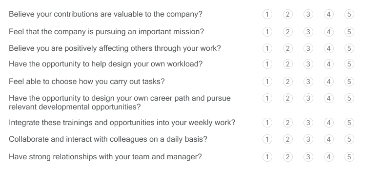 Here’s a simple framework to use for assessing the meaningfulness an employee finds in their work. Ask employees to consider these questions, with 1 being the lowest rating and 5 being the highest. Then discuss them together in your one-on-ones.