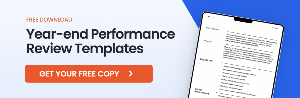Wondering what type of questions to include in a year-end performance review? To help you get started, we’re providing 2 different templates that can be used for your next year-end performance review!